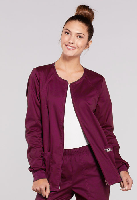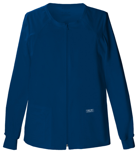 A Modern Classic fit round neck zip front warm-up jacket features two patch pockets, a right side pocket with a sectional pocket and I.D. loop, back yoke, back princess seams for slimming fit, and matching knit cuffs. Center back length: 27″.