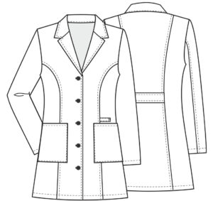 A Modern Classic fit, stylish and figure flattering button front lab coat features a notched lapel, front patch pockets, an instrument loop over the left pocket, front and back princess seams, and a back belt. Center back length: 33″