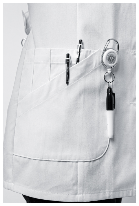 A Contemporary fit button front lab coat features a notched lapel and 3/4 length sleeves with side vents that can be folded up as cuffs. Also featured are four patch pockets (one with utility strap and D-ring), back darts and a center back belt for shaping. Center back length: 30″.